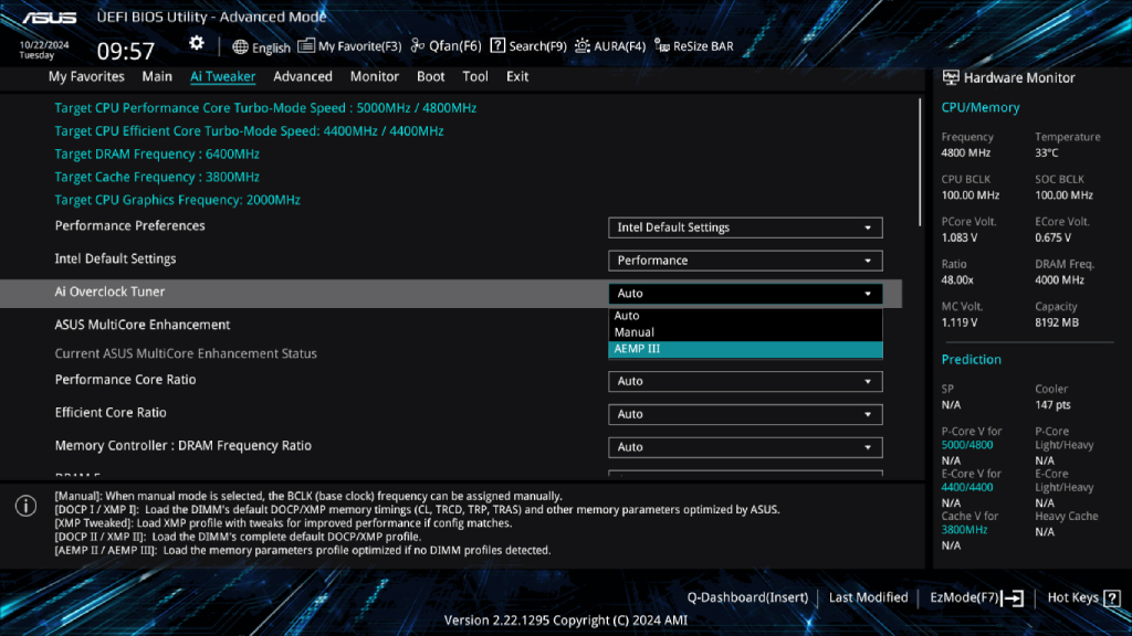 ASUS Enhanced Memory Profile III (AEMP III) — это усовершенствованная функция прошивки, позволяющая пользователям достичь непревзойденной производительности памяти с использованием передовых модулей CUDIMM. Благодаря двухэтапному комплексному процессу настройки, AEMP III сначала оптимизирует тактовую частоту драйвера, а затем частоту памяти. Это обеспечивает оптимальный баланс между производительностью и стабильностью даже на самых высоких скоростях DDR5-8000 и выше.*